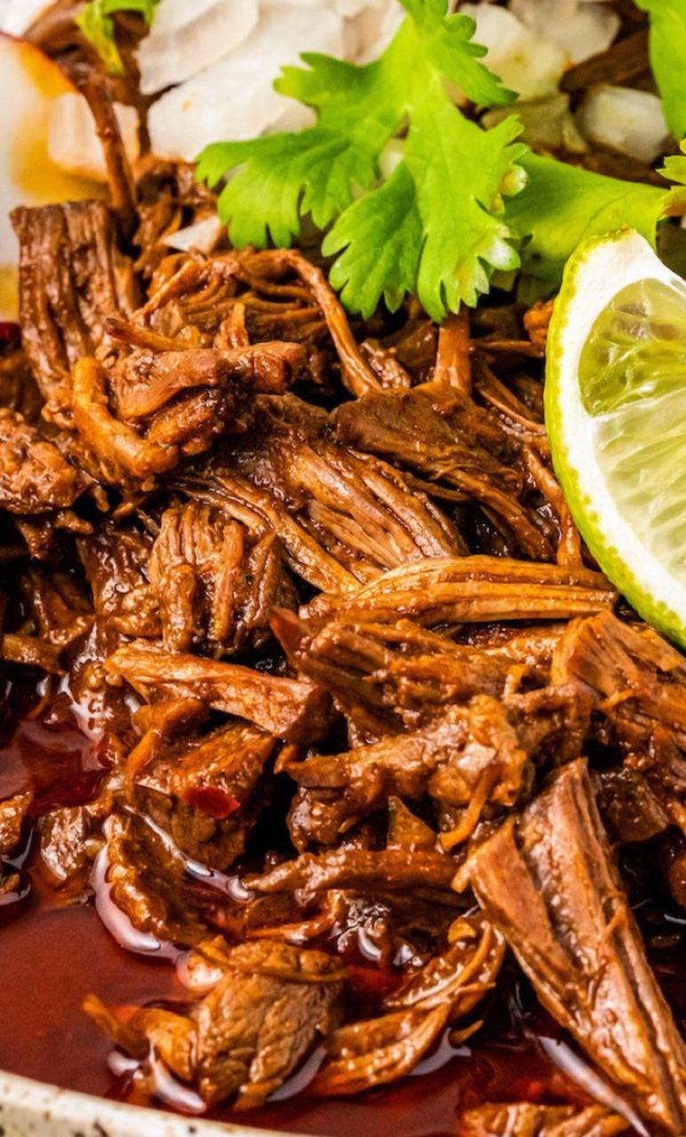 Caldo de birria con carne desmenuzada, servido con fideos, huevo duro, queso, picado de cebolla y cilantro, acompañado de nachos tostados.