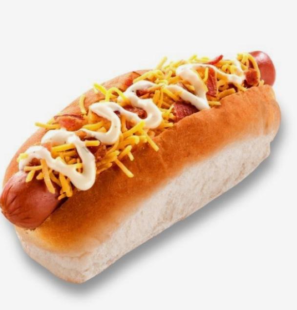 Pan brioche, salchicha americana, queso doble crema, papas cabello de ángel, cebolla crispy, tocineta, cebolla caramelizada y salsa de la casa.