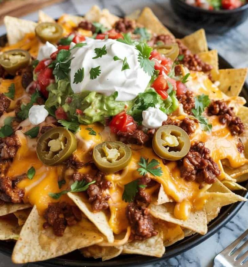 La más auténtica receta mexicana, deliciosos nachos en salsa de chile, trozos de aguacate acompañados de carne de res, cerdo o pollo y queso fundido.
