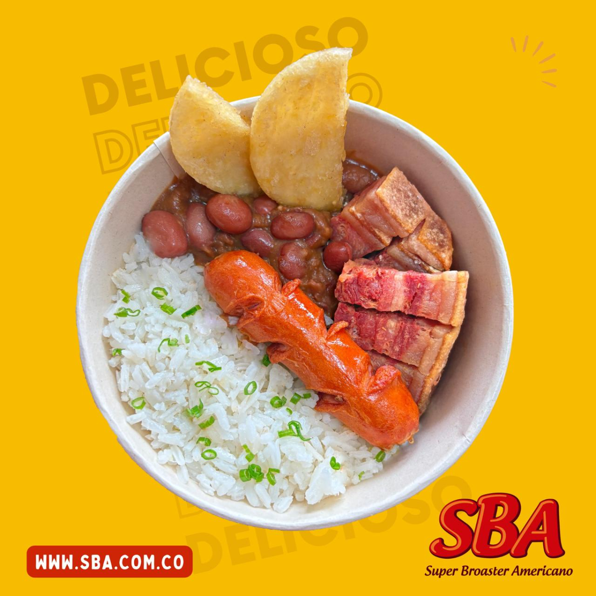 Arroz blanco, frijol, chorizo, chicharrón y arepa.