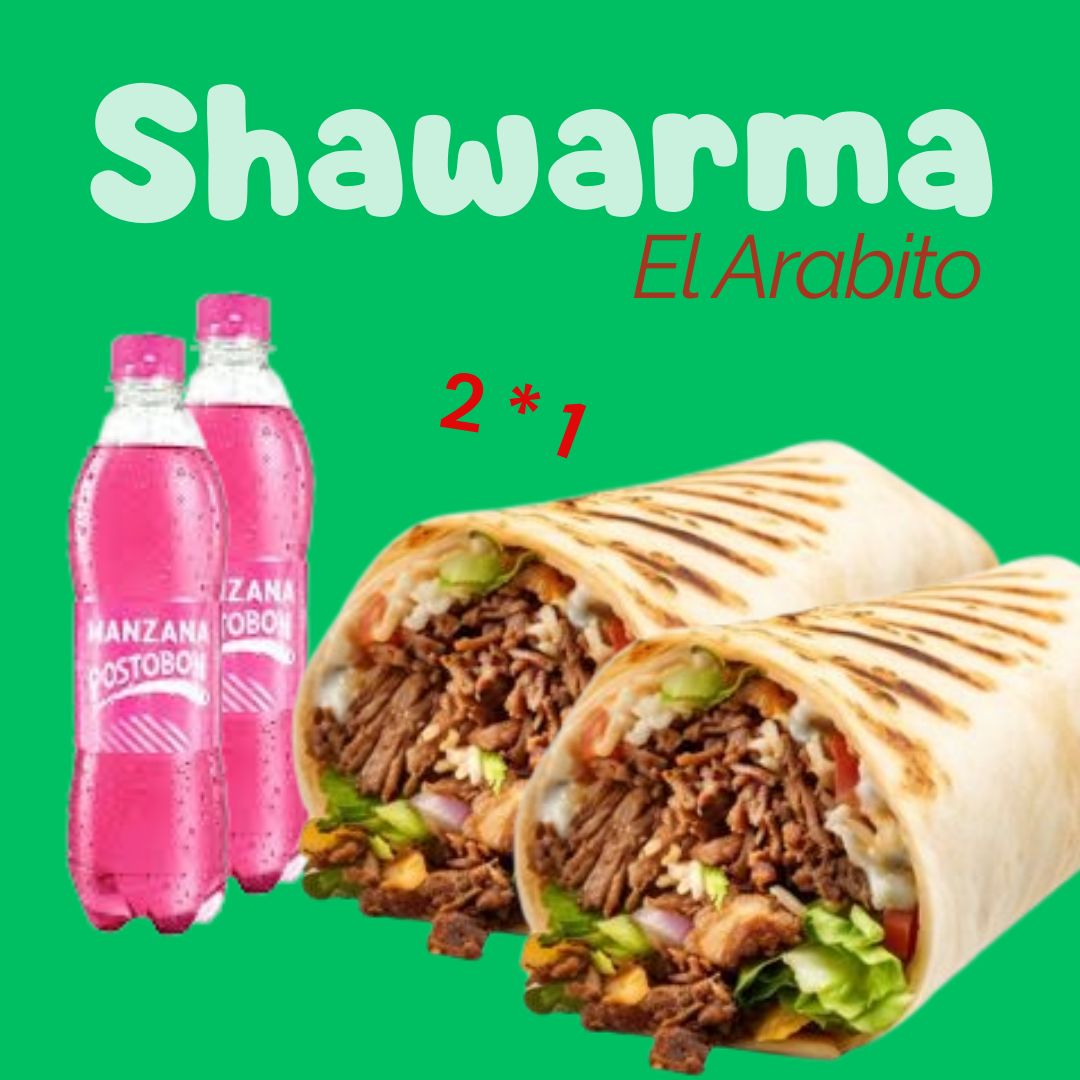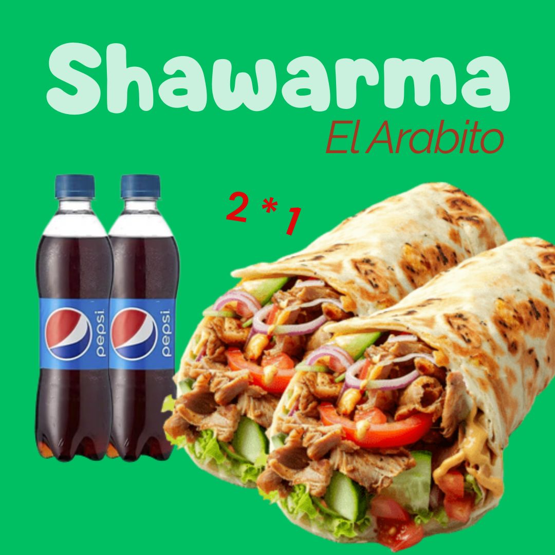 2 Shawarmas vegetariano, pan árabe, lechuga, tomate, huevo, pepinillo, salsa de la casa, 2 bebidas Postobón 250 ml.