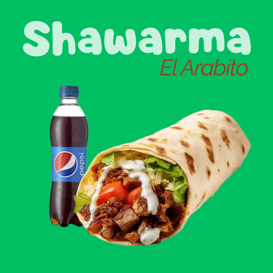 Pan árabe, carne, salsa de la casa, tabule, lechuga, bebida Postobón 250 ml.