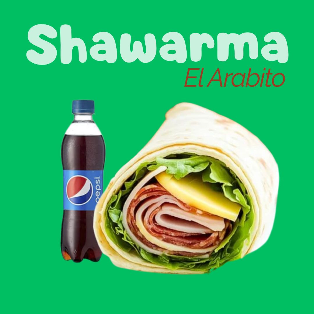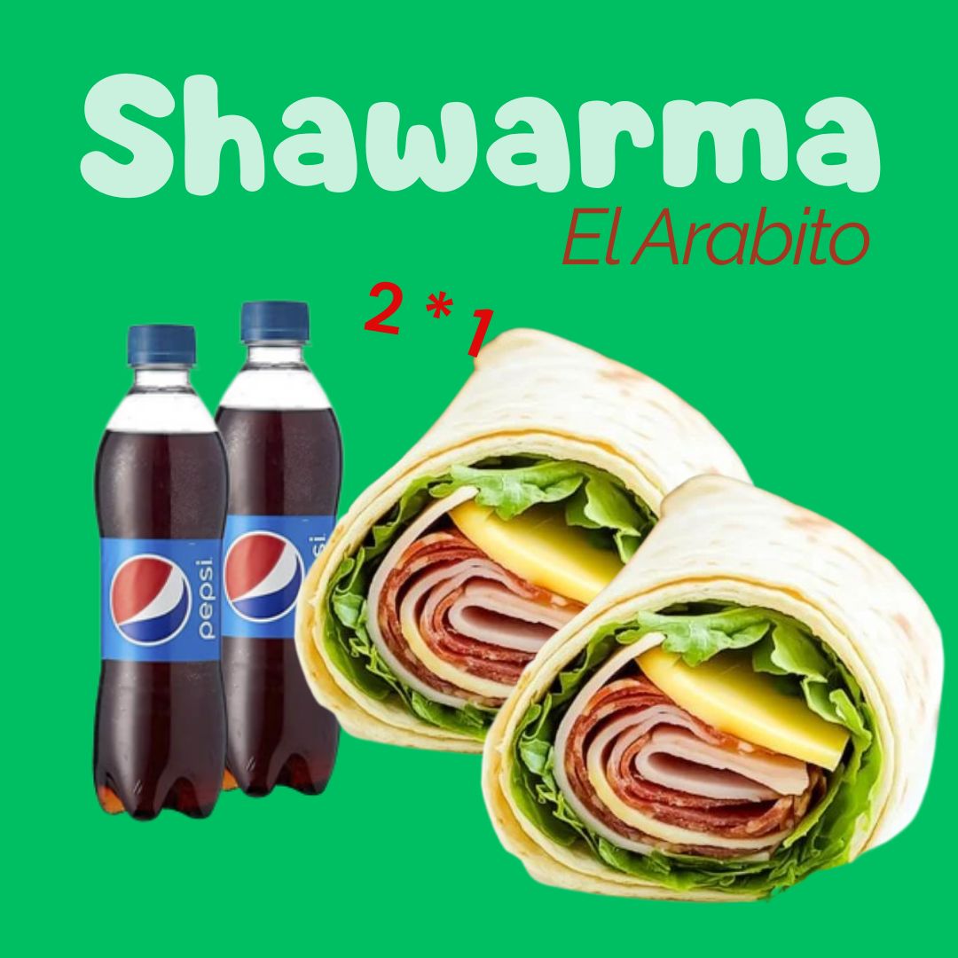 2 Shawarmas de jamón y queso, lechuga y tomate, bebida Postobón 250 ml.