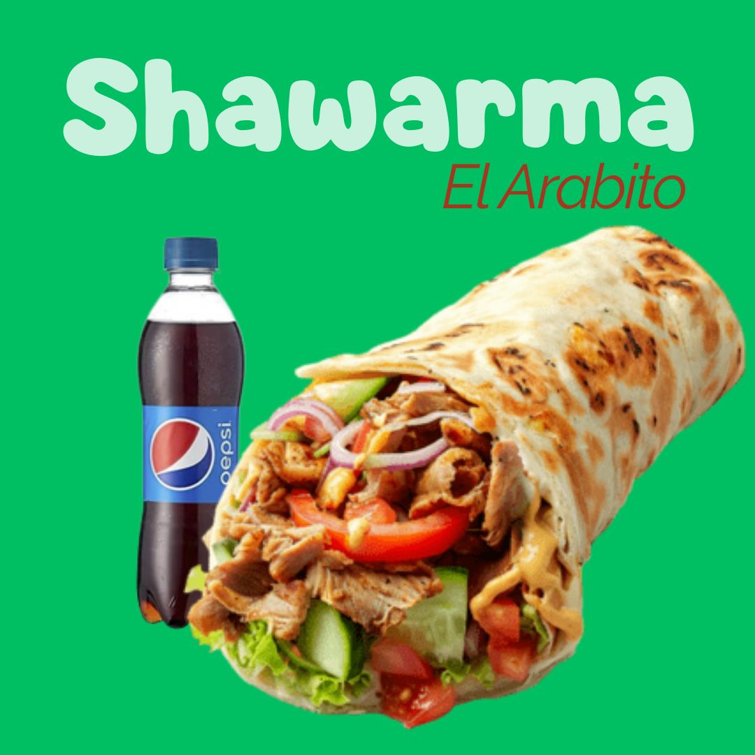 Shawarma de pollo al grill, salsa, lechuga, tomate, bebida Postobón 250 ml.