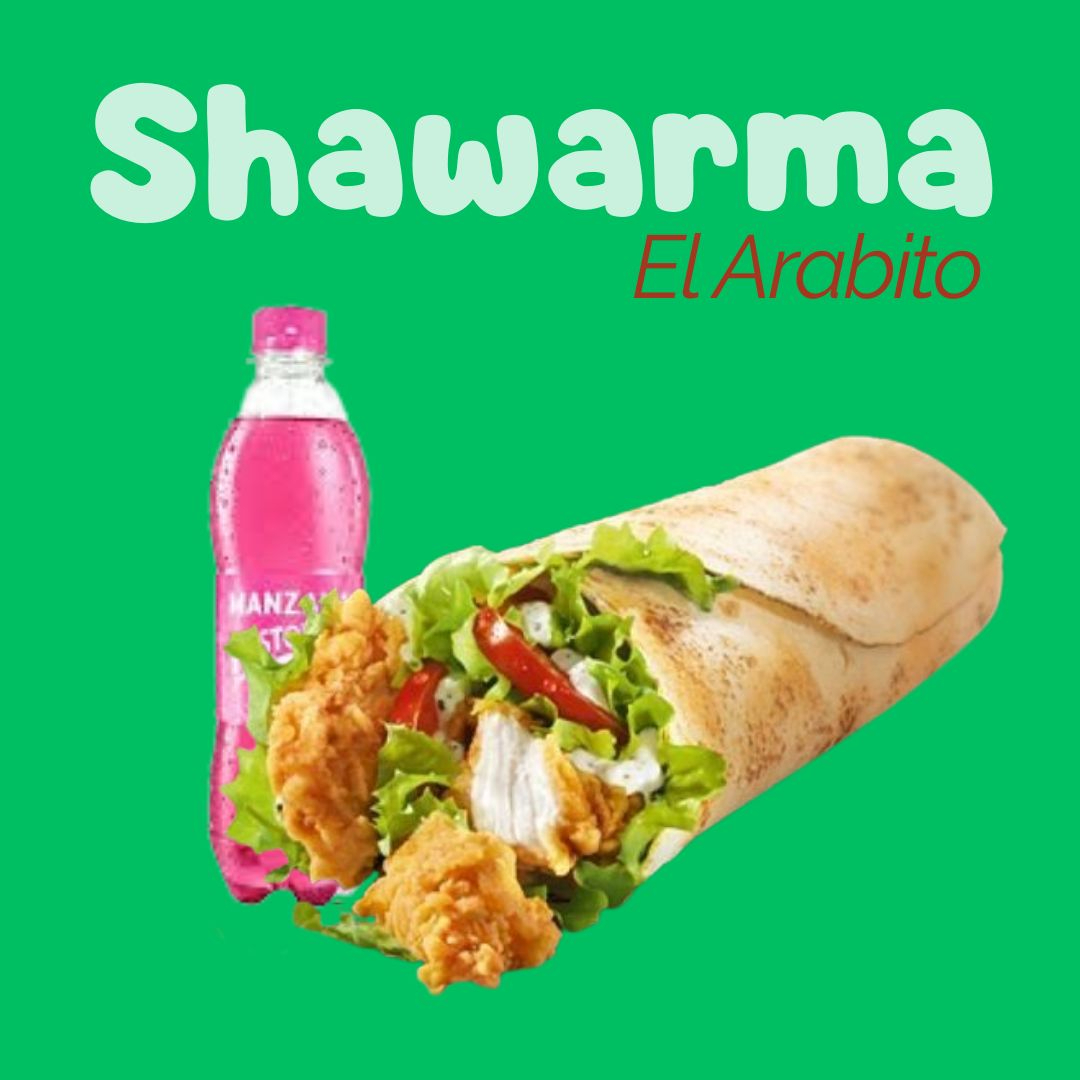 Shawarma de pollo al grill, salsa, lechuga, tomate y bebida Postobón 250 ml.