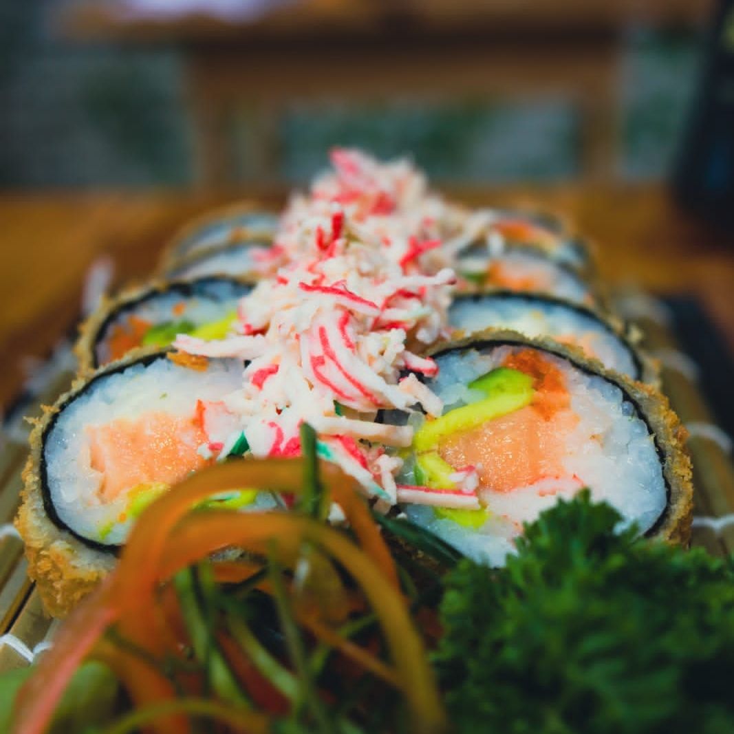 Fino corte de salmon aguacate, queso crema tempurizado, bañado en salsa ikigai y teriyaki