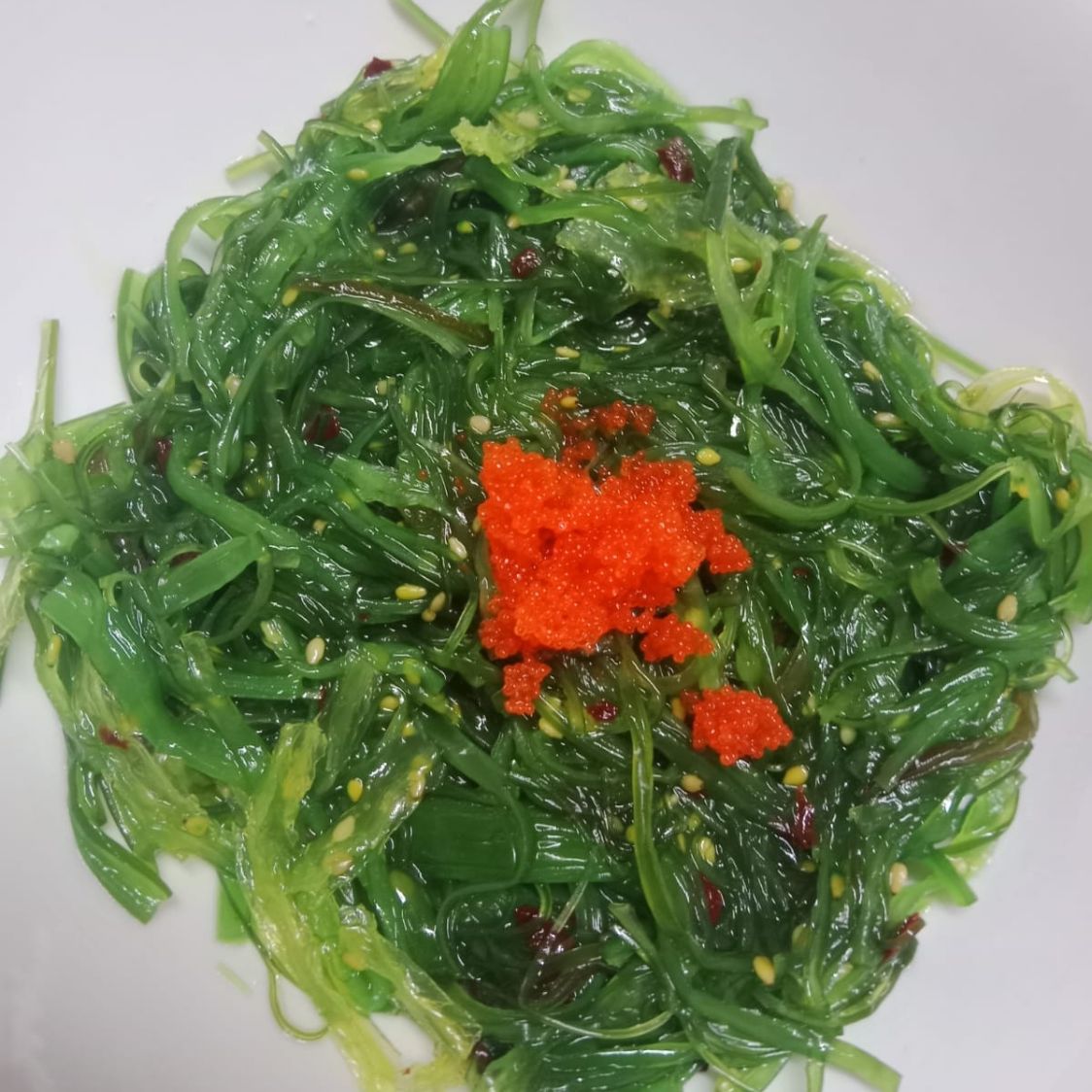 Palmito de Cangrejo,queso crema , aguacate ,cubierto de salmon, flameado con salsa ikigai Topping de wakame y masago arare 12 BOCADOS SOLO INCLUYE SALSA DE SOYA