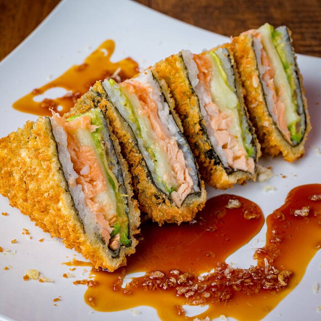 sushi en forma de sandwich tempura rellena de salmon