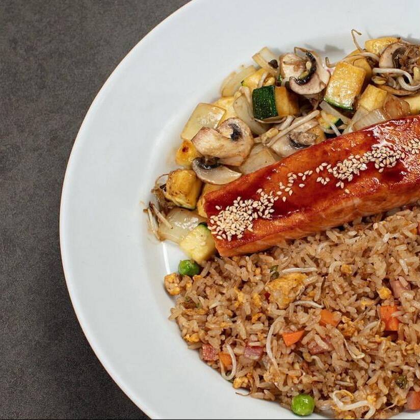 salmon sellado en teriyaki con arroz y verduras