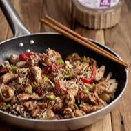 Arroz oriental salteado al wok con mezclum de verduras y tiras de pollo teriyaki.