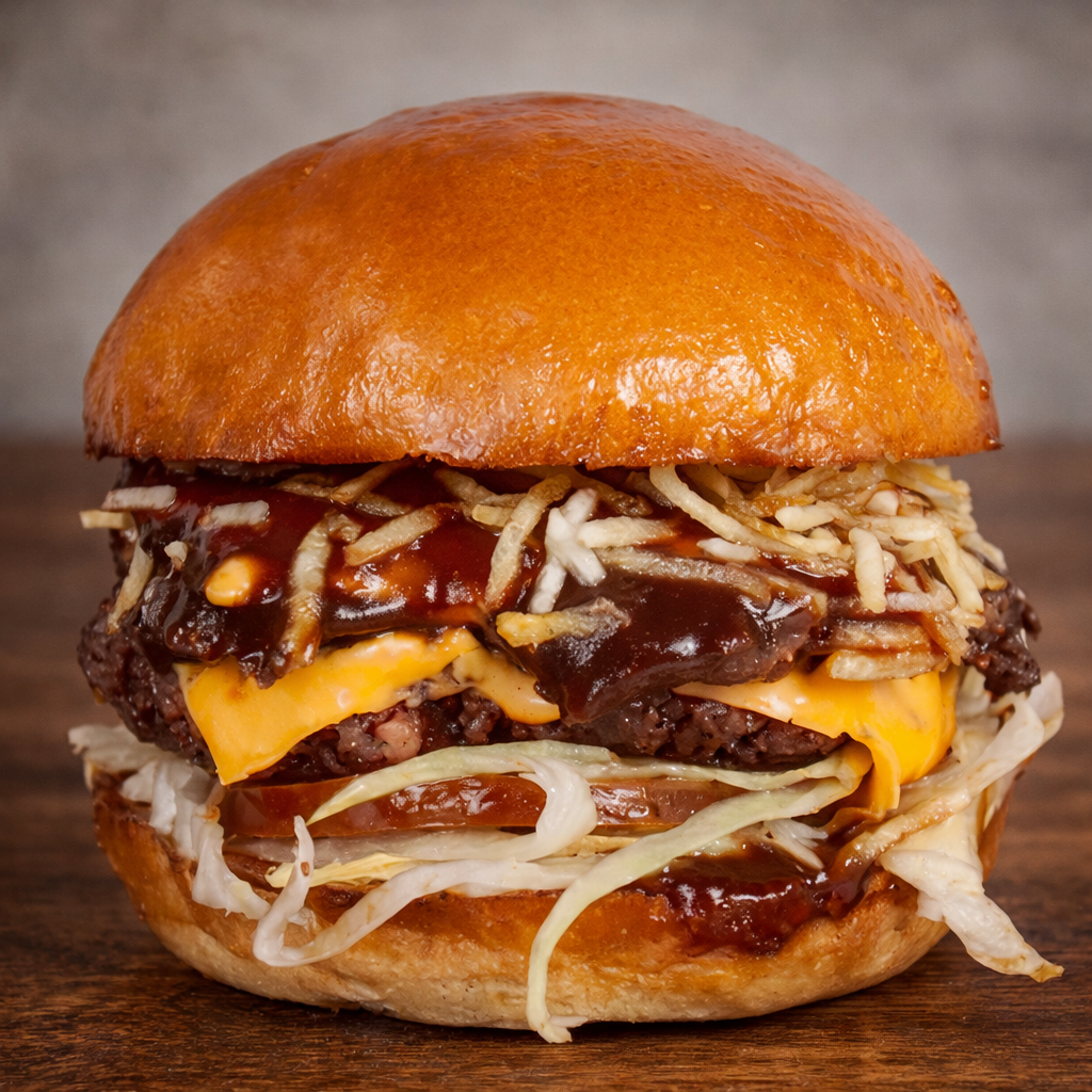 Hamburguesa de 180 gr (doble carne) Bañada en salsa ahumada tipo BBQ con reduccion de Whiskey Jack Daniel's Special, queso y cebolla crispy