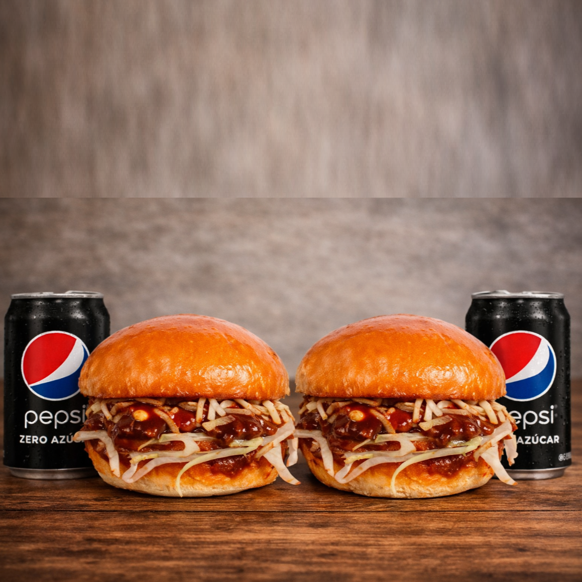Hamburguesa de 180 gr (doble carne) Base de mostaza dijon y salsa abufalada aromatizada con mantequilla, queso y pimentones morroneados