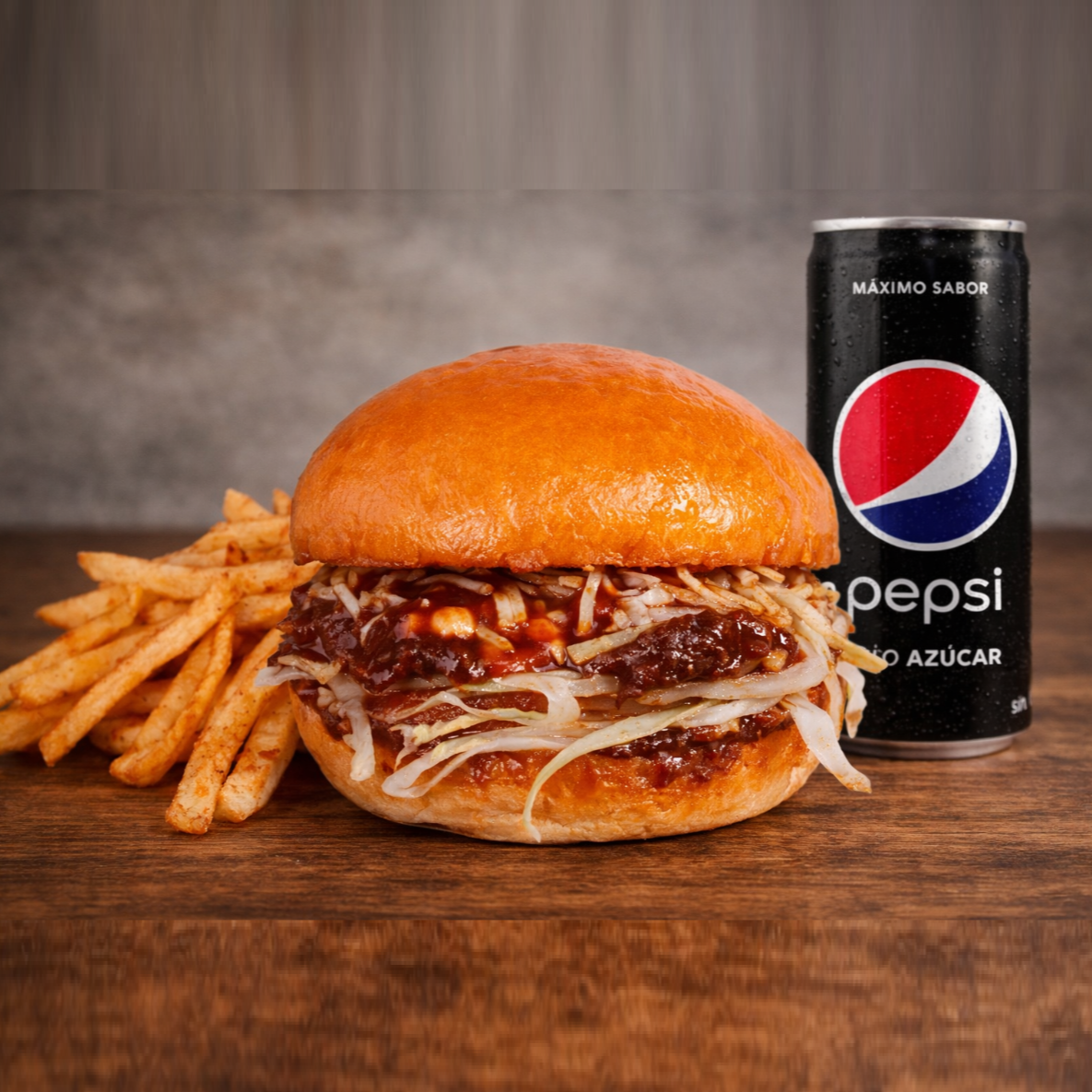 Hamburguesa de 180 gr (doble carne) Bañada en salsa ahumada tipo BBQ con reduccion de Whiskey Jack Daniel's Special, queso y cebolla crispy, acompañada de 150gr de papas y gaseosa 265ml.