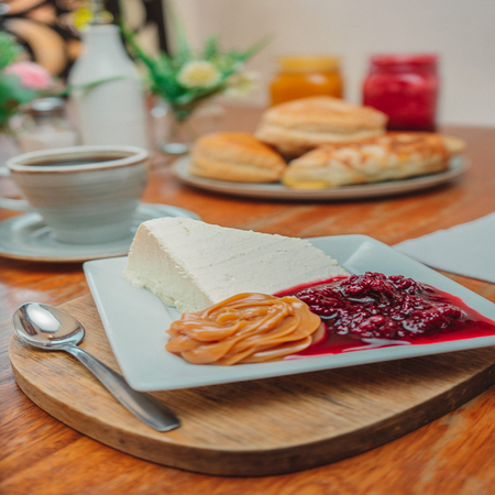 Queso tradicional tipo cuajada con opción de dulce a elegir.
