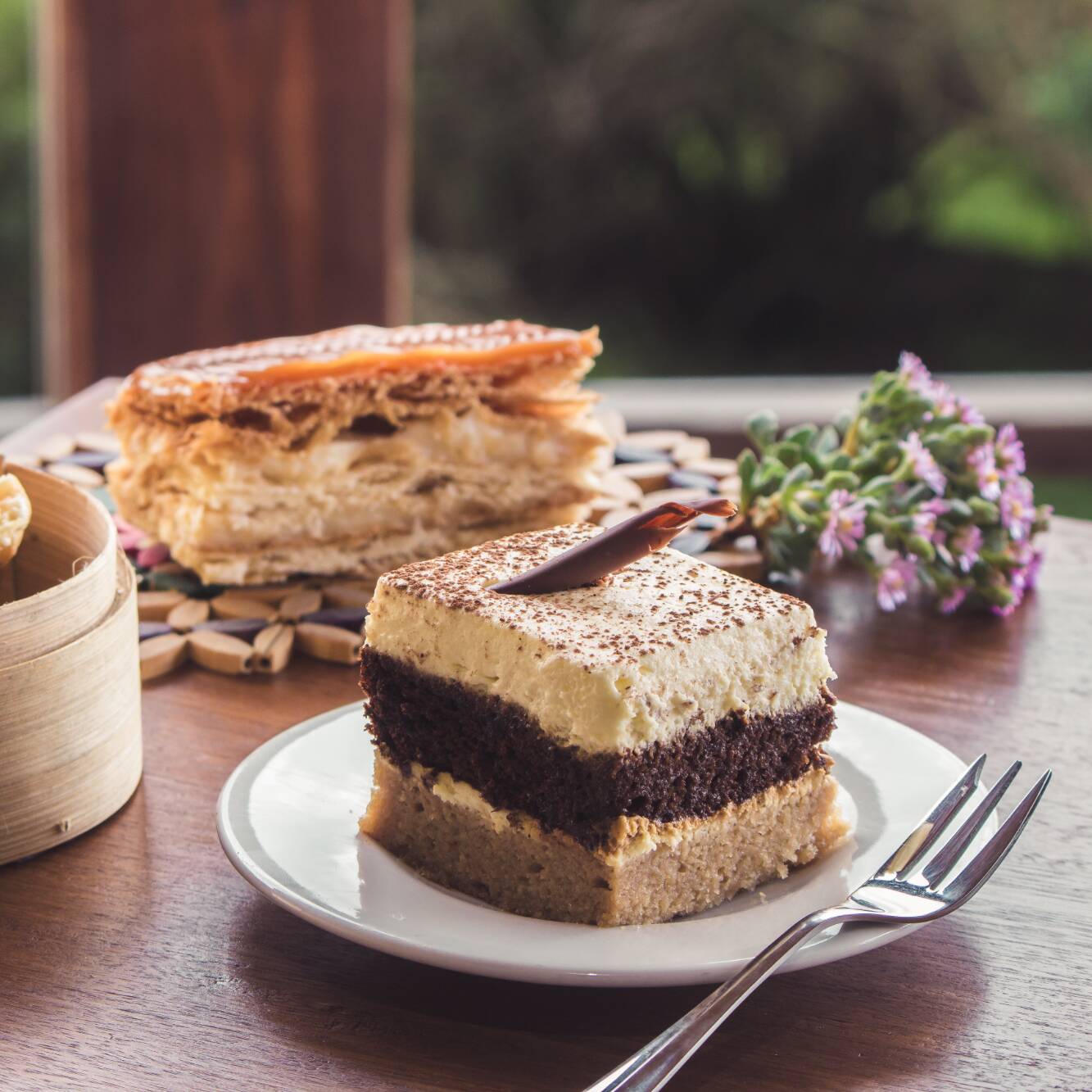 Capas de bizcochos de soletilla empapados en café y crema de mascarpone con un toque de licor de marsala, espolvoreado con cacao en polvo.