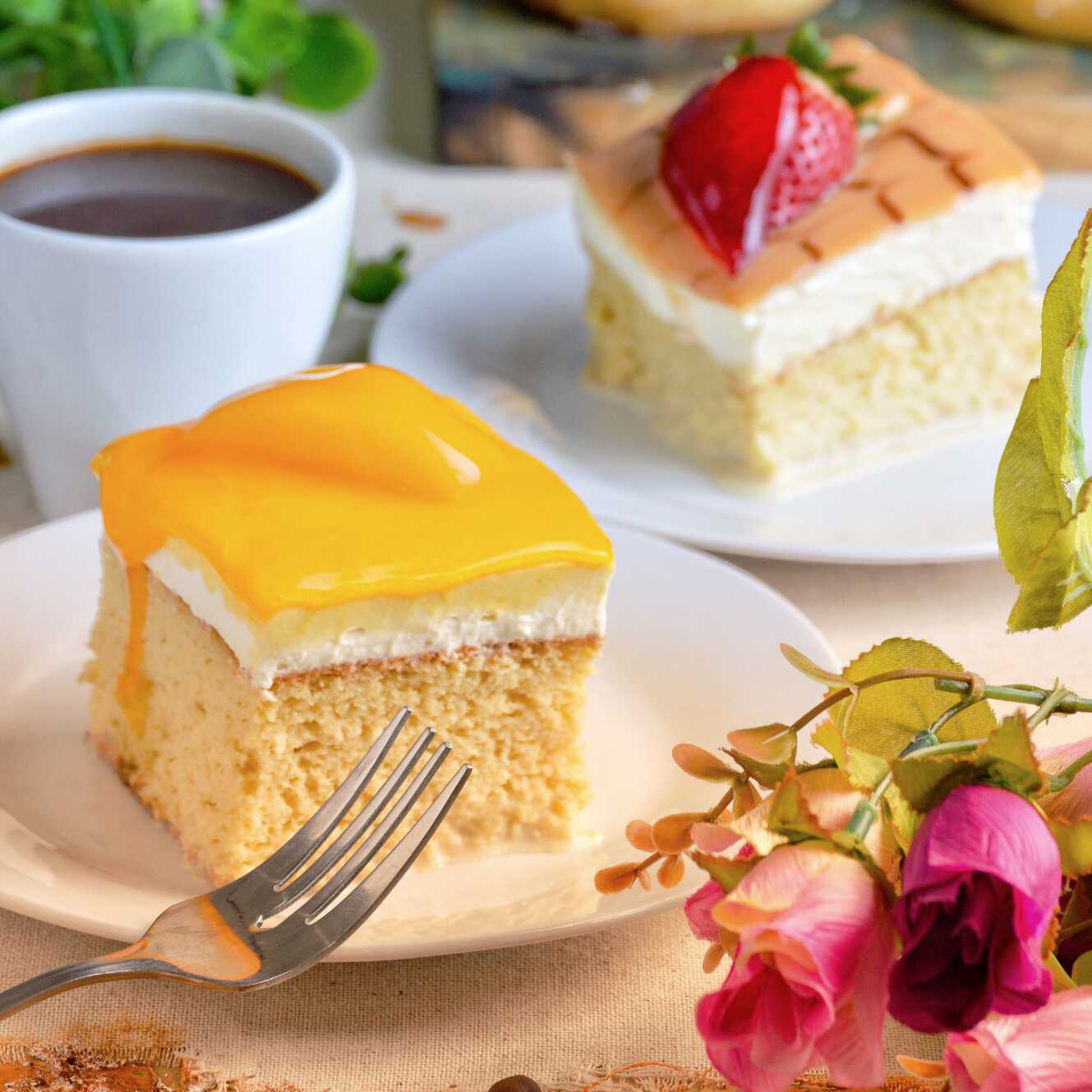 Delicioso postre de tres leches con cobertura de dulce a elegir.