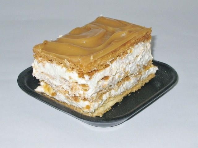 Finas y delgadas capas de hojaldre rellenas de una suave y delicada crema chantilly, bañada en arequipe.