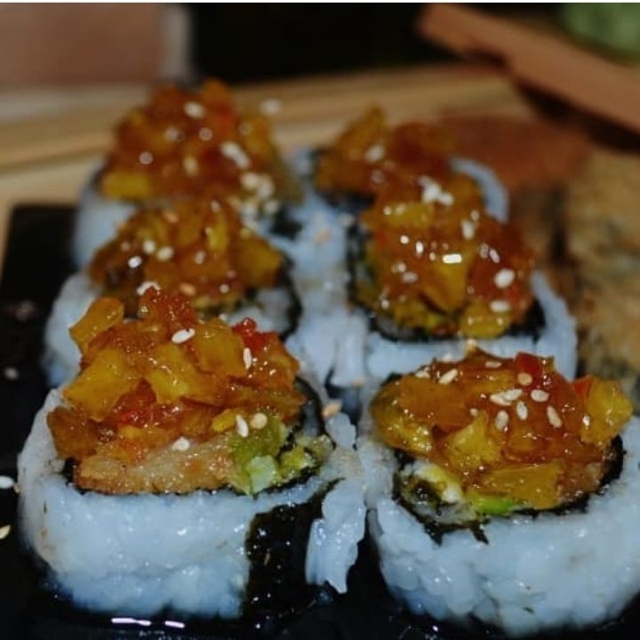 roll tempura, con u interior de cangrejo y aguacate, su topping de atun marinado con una superficie de seaweed salad que te sorprendera.