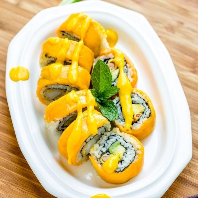 CANGREJO Y LANGOTINO AL PANKO, QUESO CREMA Y AGUACATE EN SU INTERIOR. CUBIERTO EN PATANO, BAÑADO EN SALSA DE AJI AMARILLO.