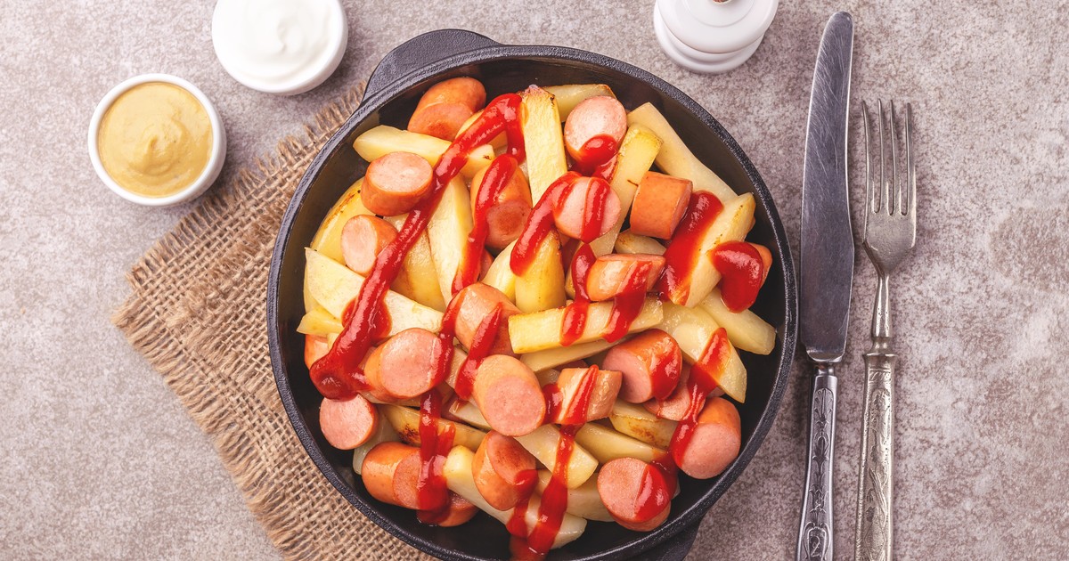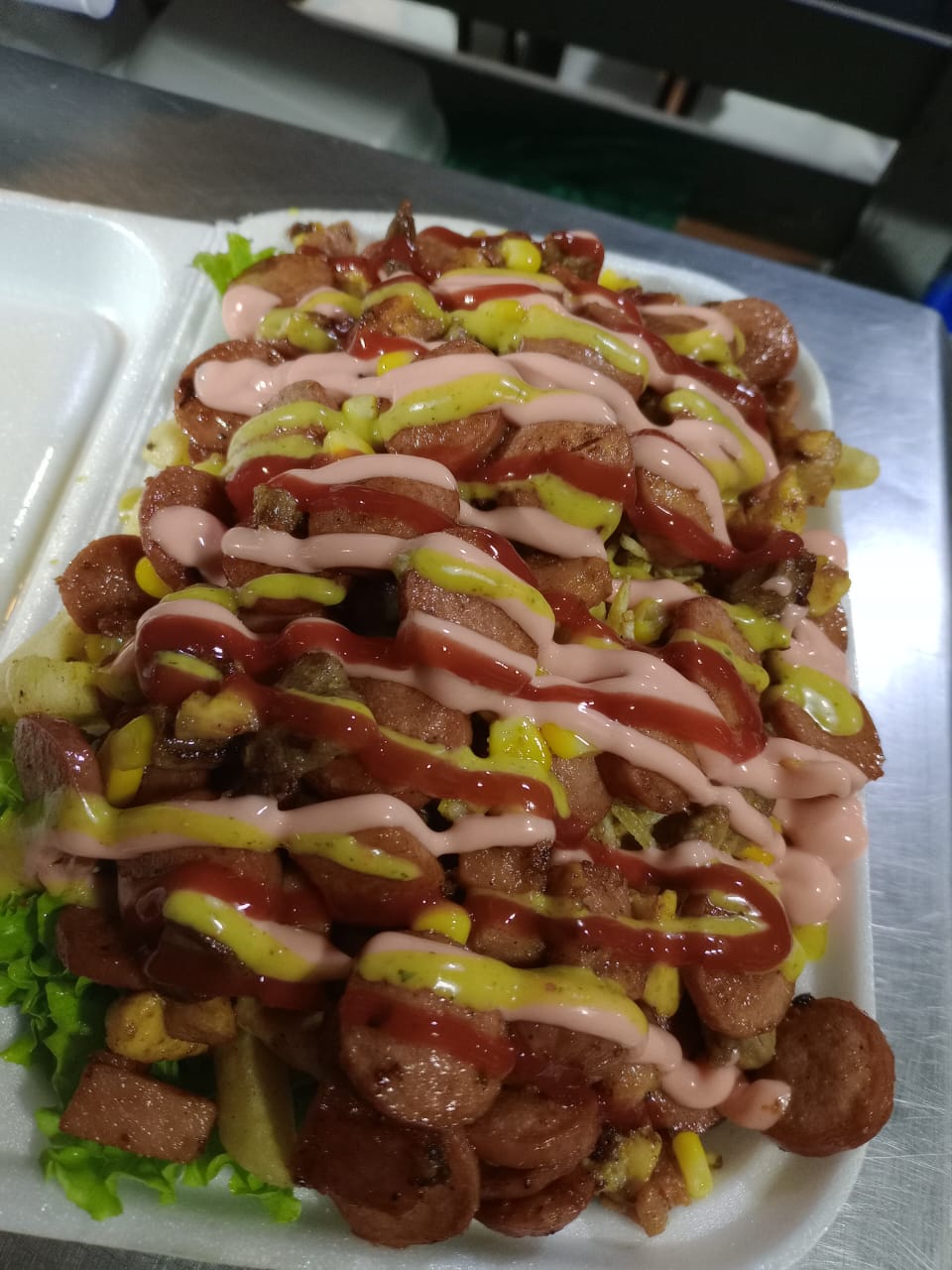 Papas a la francesa, Salchicha, Pollo, Carne picada, queso y Maiz