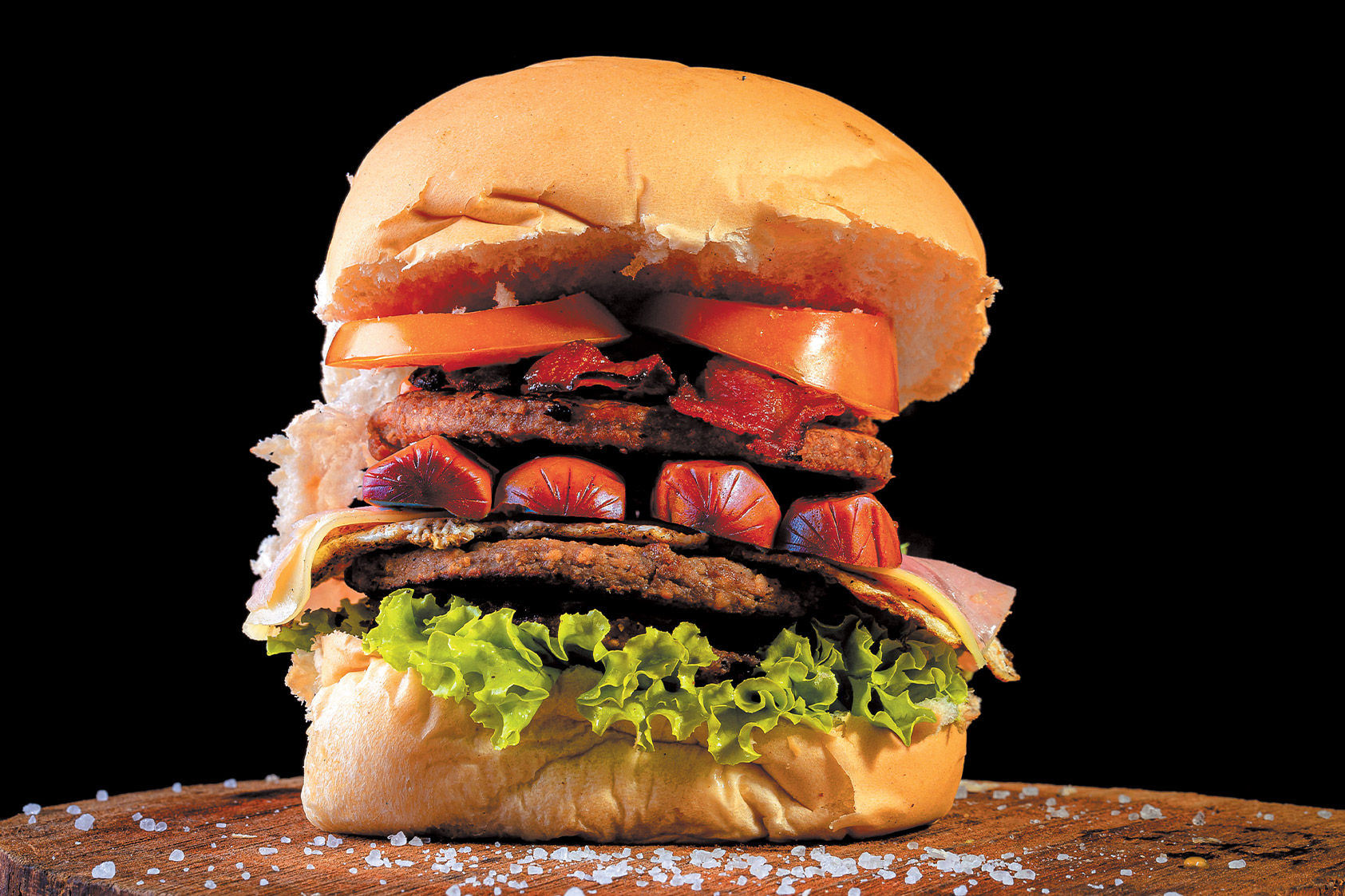 Pan Artesanal tipo brioche, carne de Res, chorizo, maiz, tocineta, jamon, queso doble crema, cebolla, tomate. lechuga, papa chips y salsas de la casa.