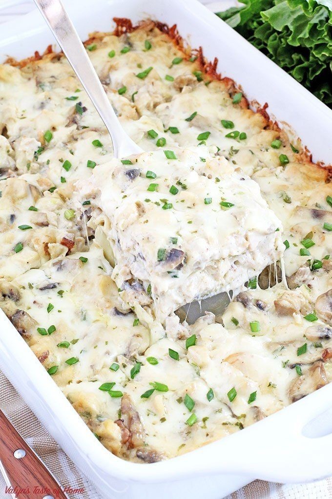Pasta tipo spaguetti, pollo,champiñones, salsa bechamel, tocineta y queso mozzarella.