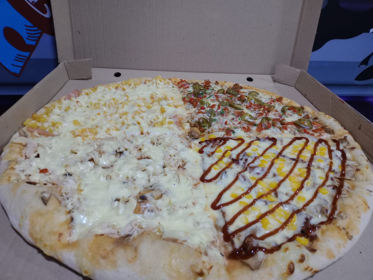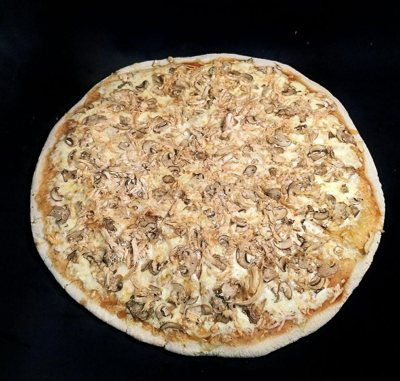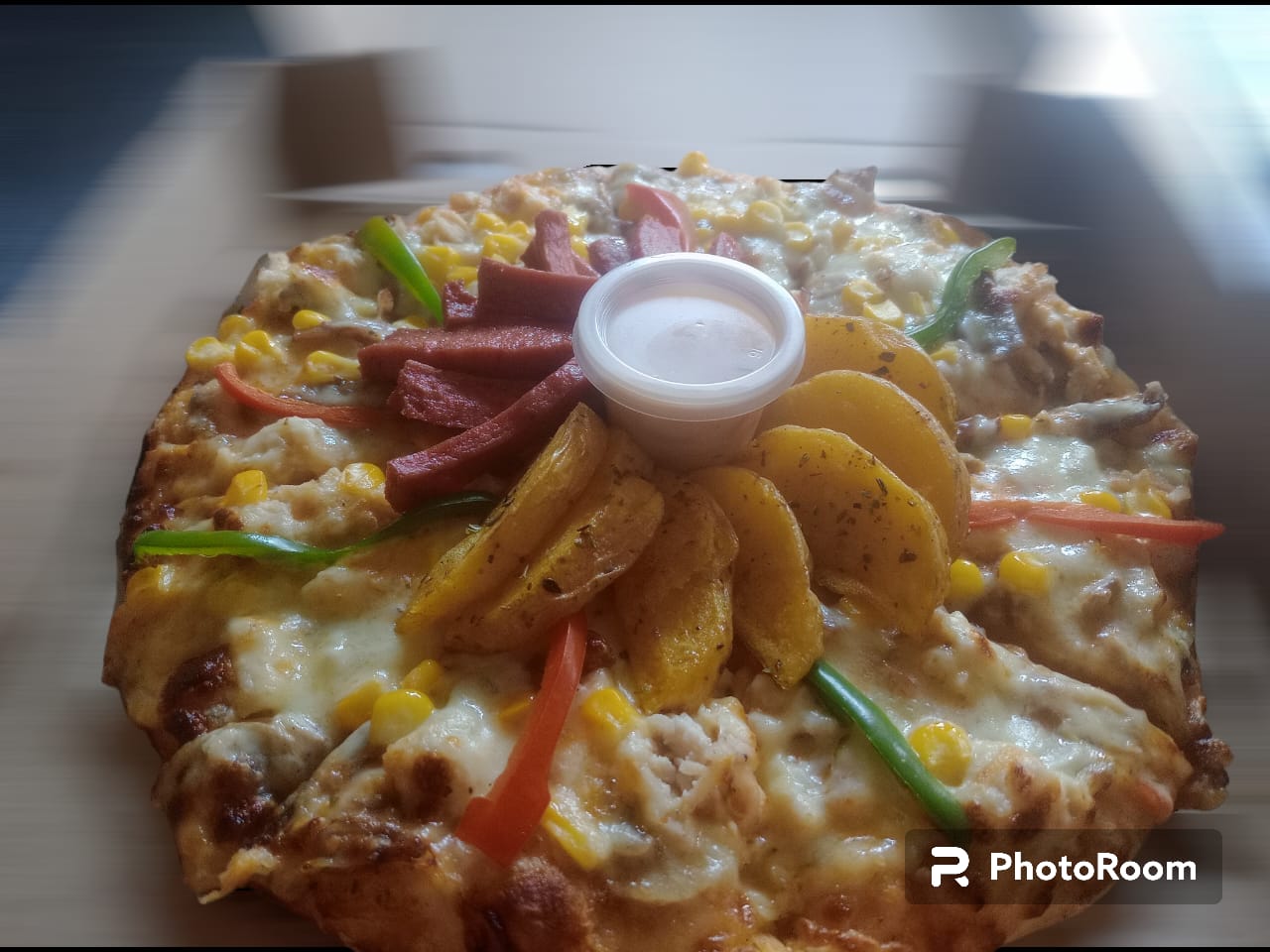 Pizza de 22CM: Carne desmechada, Pollo o Carne, Champiñones, Maíz, Pimentón, Decorada con una entrada de papas cascos, salchichas y salsa de la casa, Elije el tipo de masa.