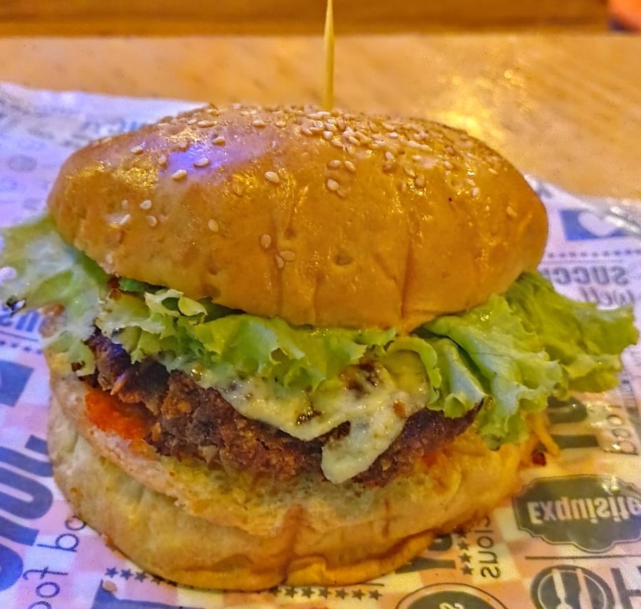 Pan Artesanal tipo brioche, carne de Res, pollo, queso doble crema, jamon, cebolla, tomate. lechuga, papa chips y salsas de la casa.