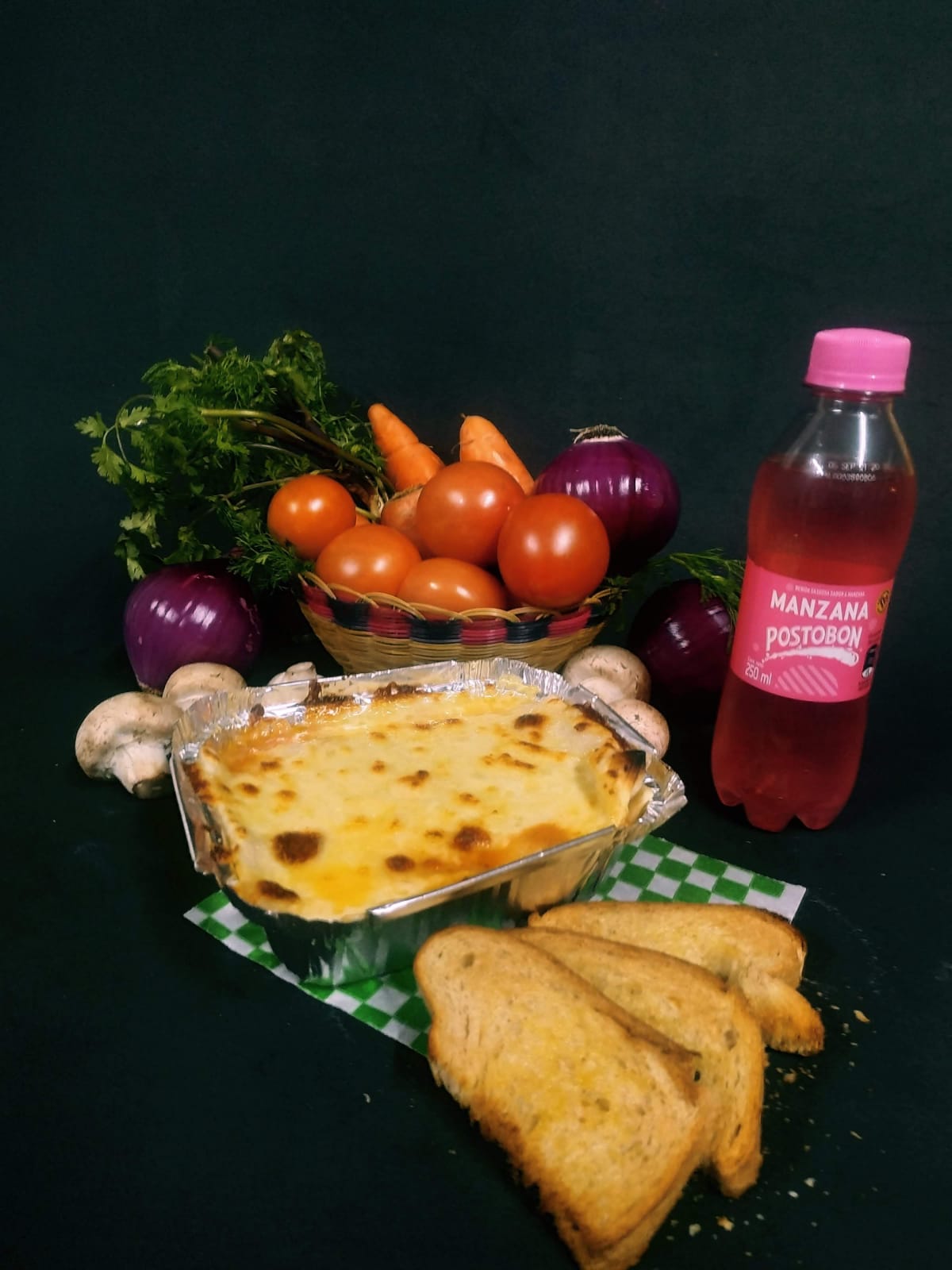 Contiene laminas de pasta por 90 Grs, carne de res molida 50 Grs y queso mozzarella 50 Grs y Gaseosa Postobón 250 ml