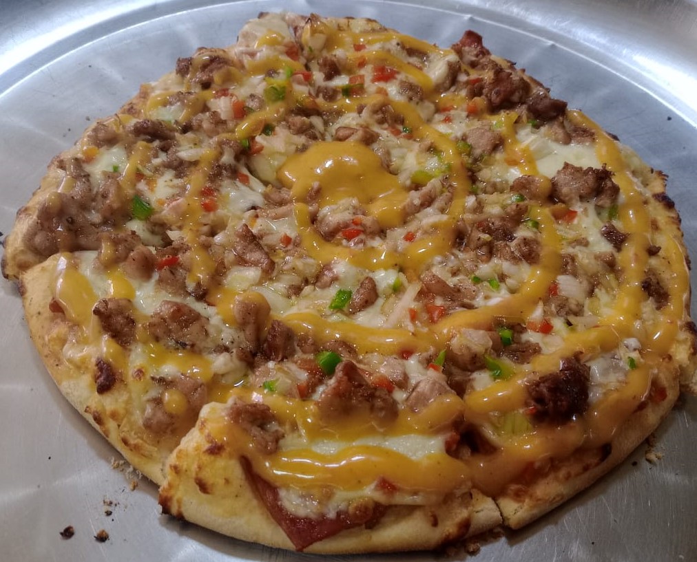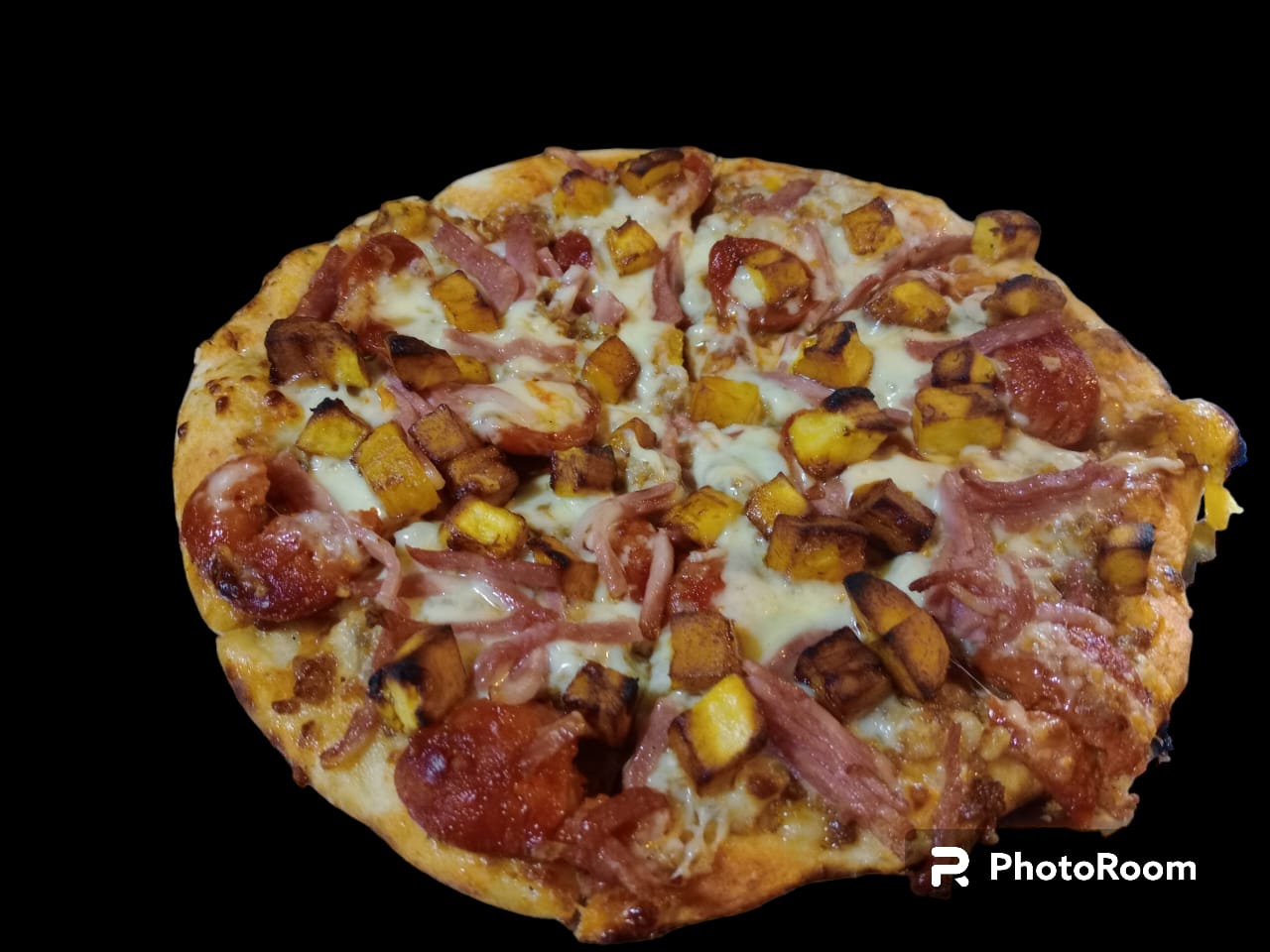 Masa Especial de Pizza en salsa napolitana o boloñesa, chicharron, tocineta, maduro, chorizo y queso.