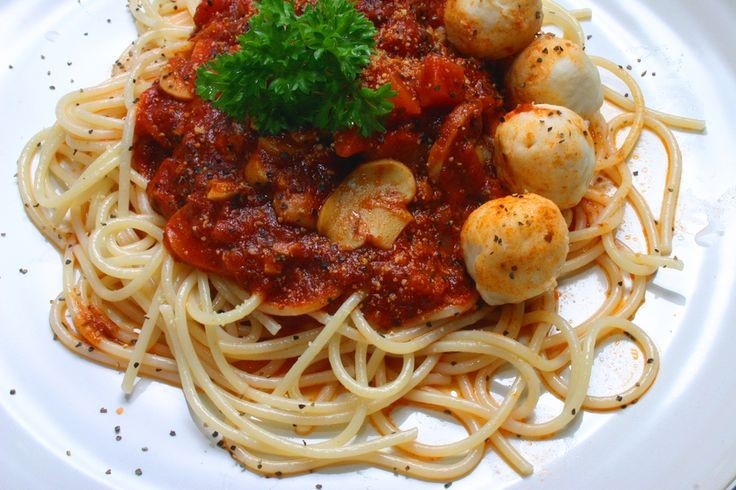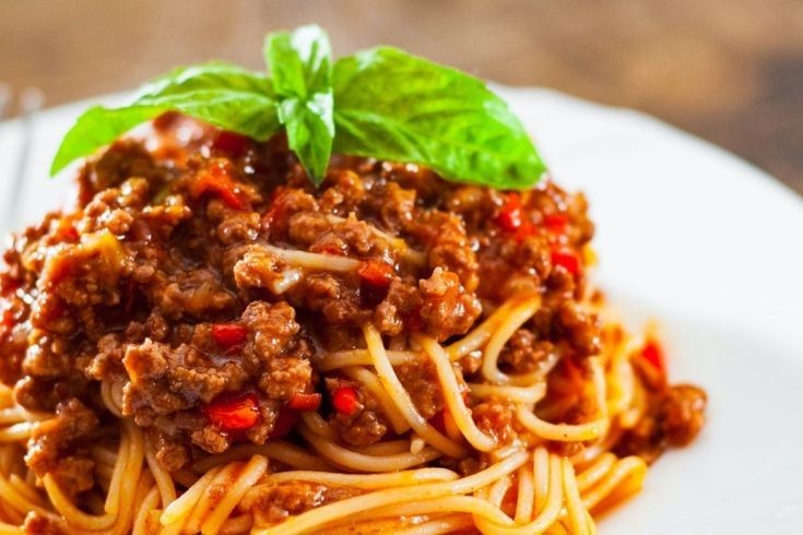 Pasta, Salsa boloñesa, pollo, jamon, queso y Champiñones.