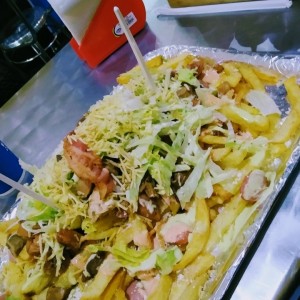 Papas a la francesa, Salchicha, Pollo, Carne desmechada, queso y Maiz
