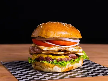 Pan Artesanal, Carne res, Doble Tocineta, Queso Mozarella, Papa chip, lechuga, tomate, cebolla y salsas de la casa