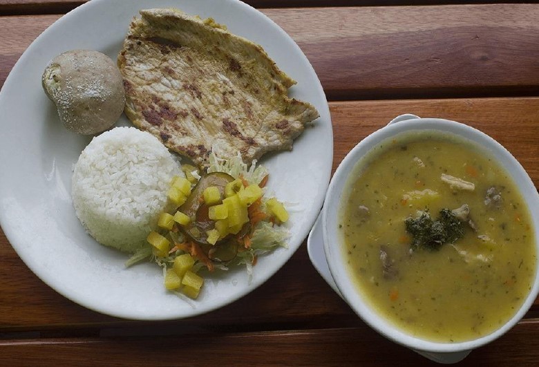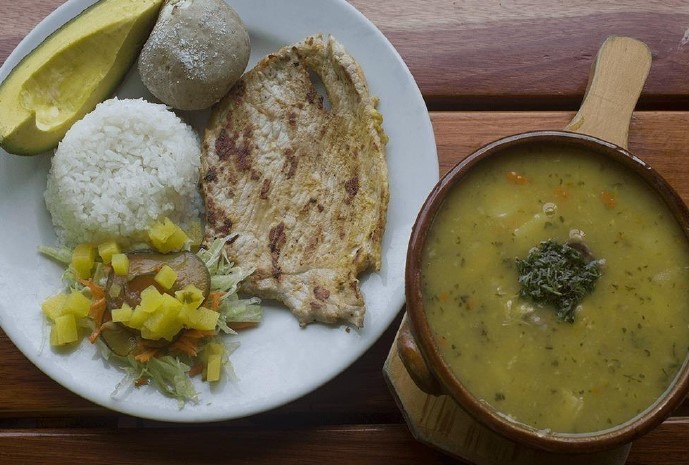 Sopa a elegir de 24 oz y en la bandeja a elegir la proteína de preferencia, acompañado de arroz, papa salada, ensalada, aguacate y limonada natural de 12 oz.