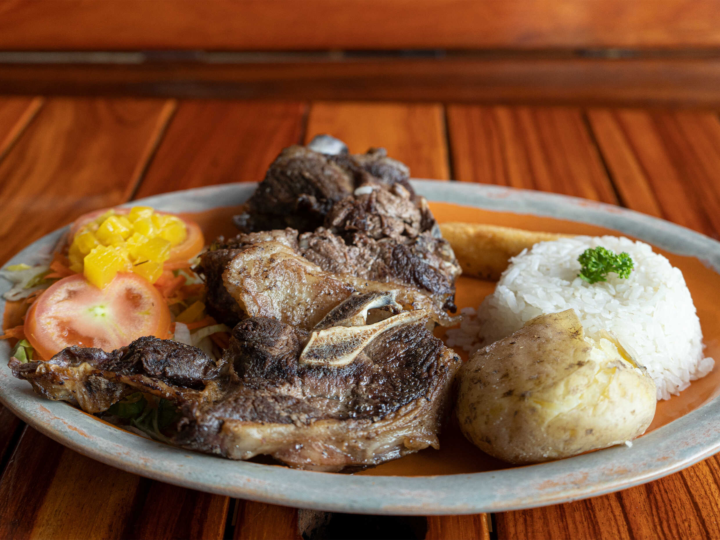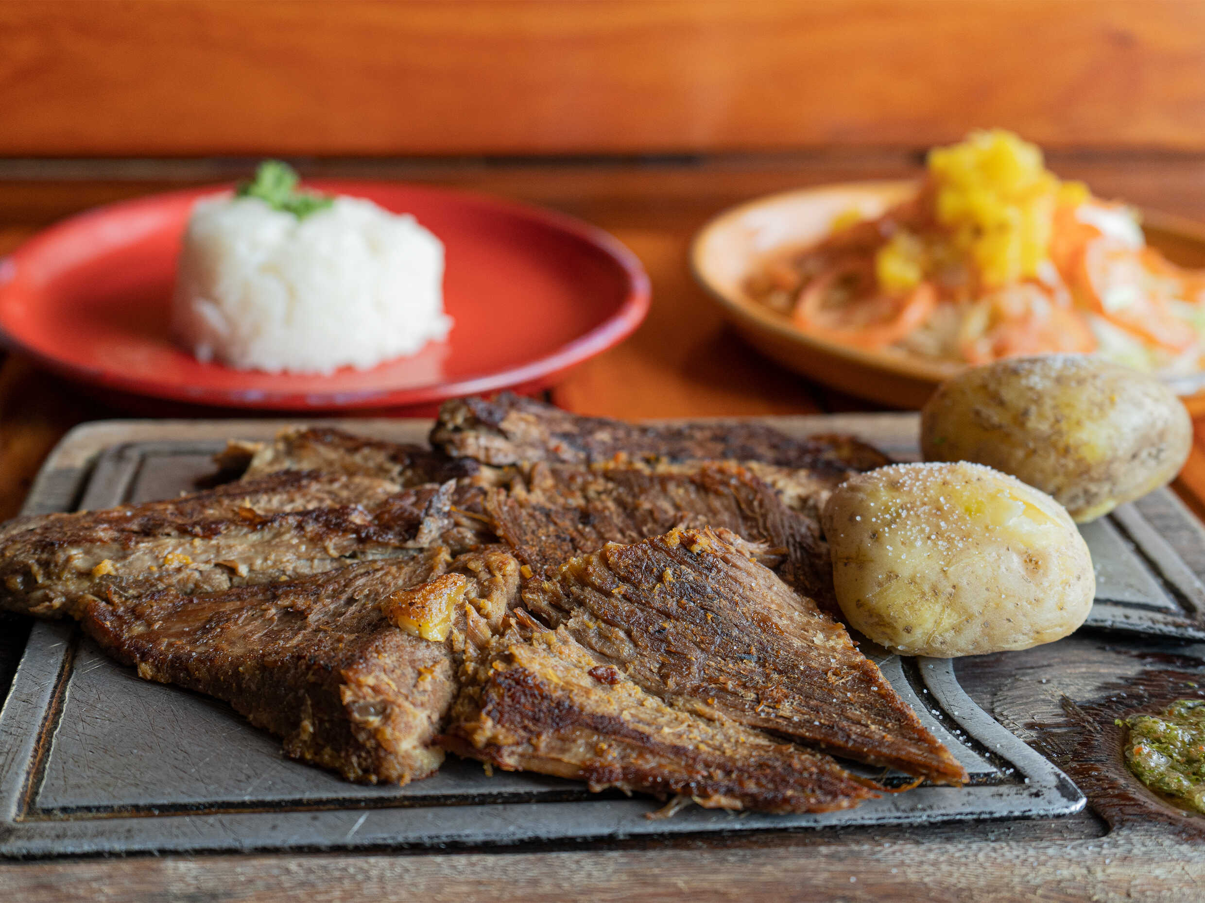 Parrillada con costillas de ternera, pechuga de pollo, chorizo, chicharrón, morcilla, papa salada, plátano, arroz, chimichurri y ensalada.