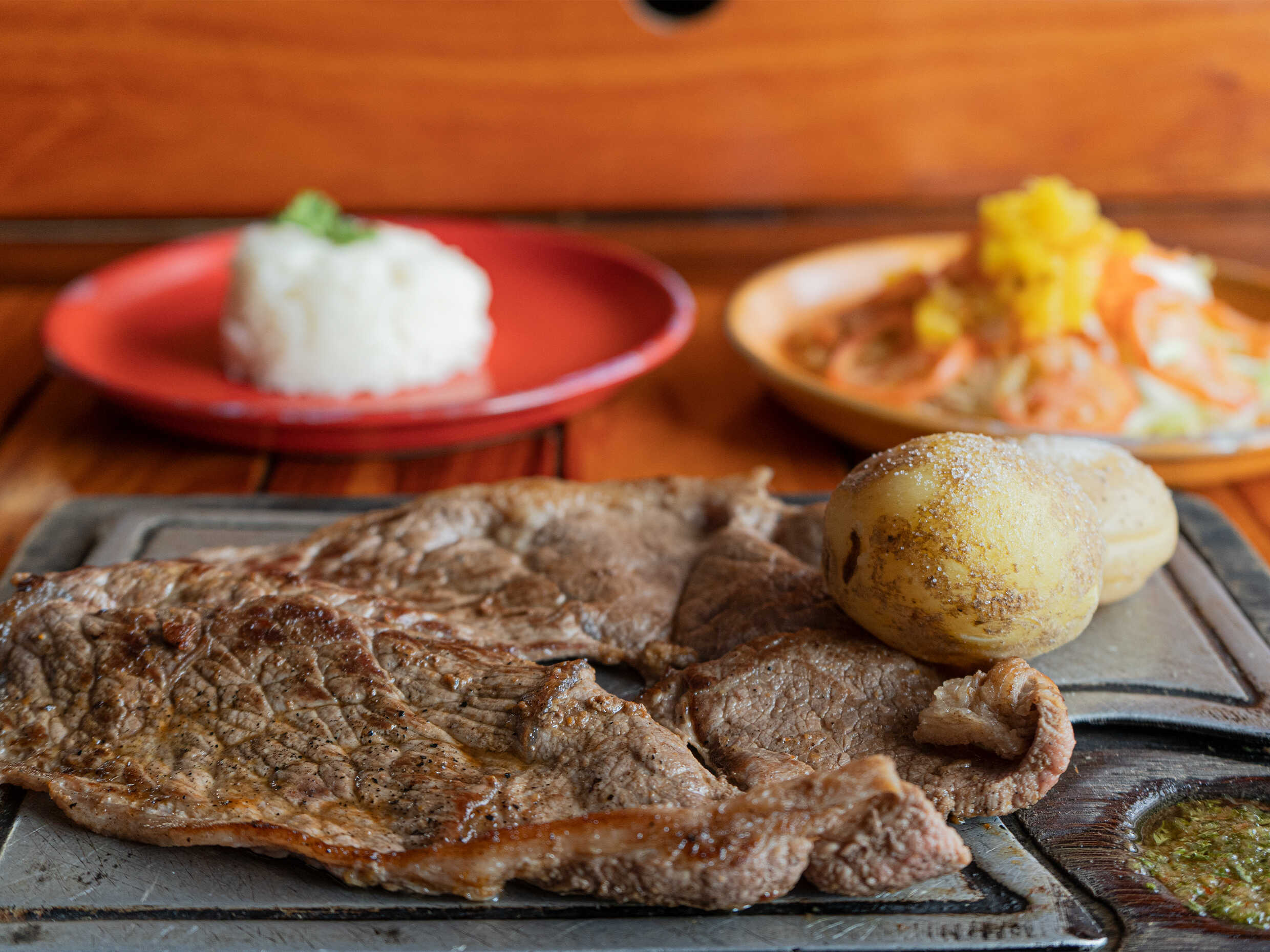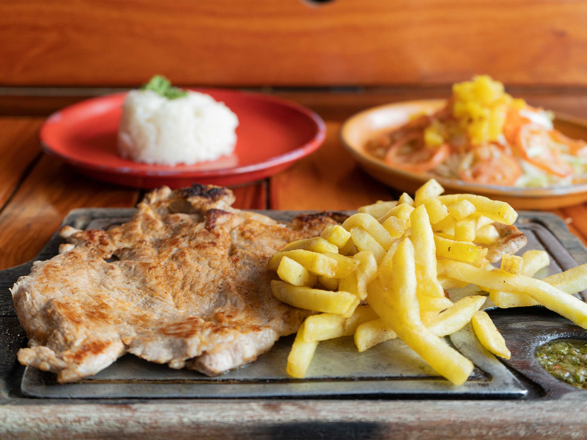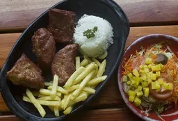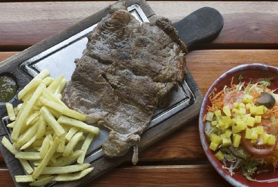 Churrasco acompañado de papa a la francesa, arroz, chimichurri y ensalada.