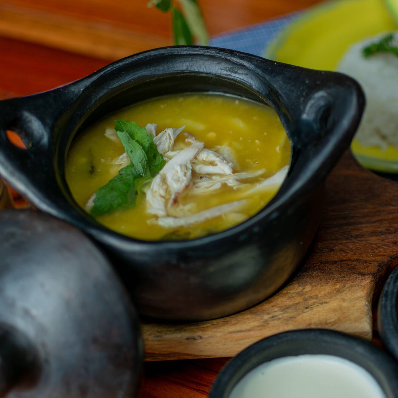 Sopa de 34 oz acompañada de crema de leche, alcaparras, arroz y aguacate.