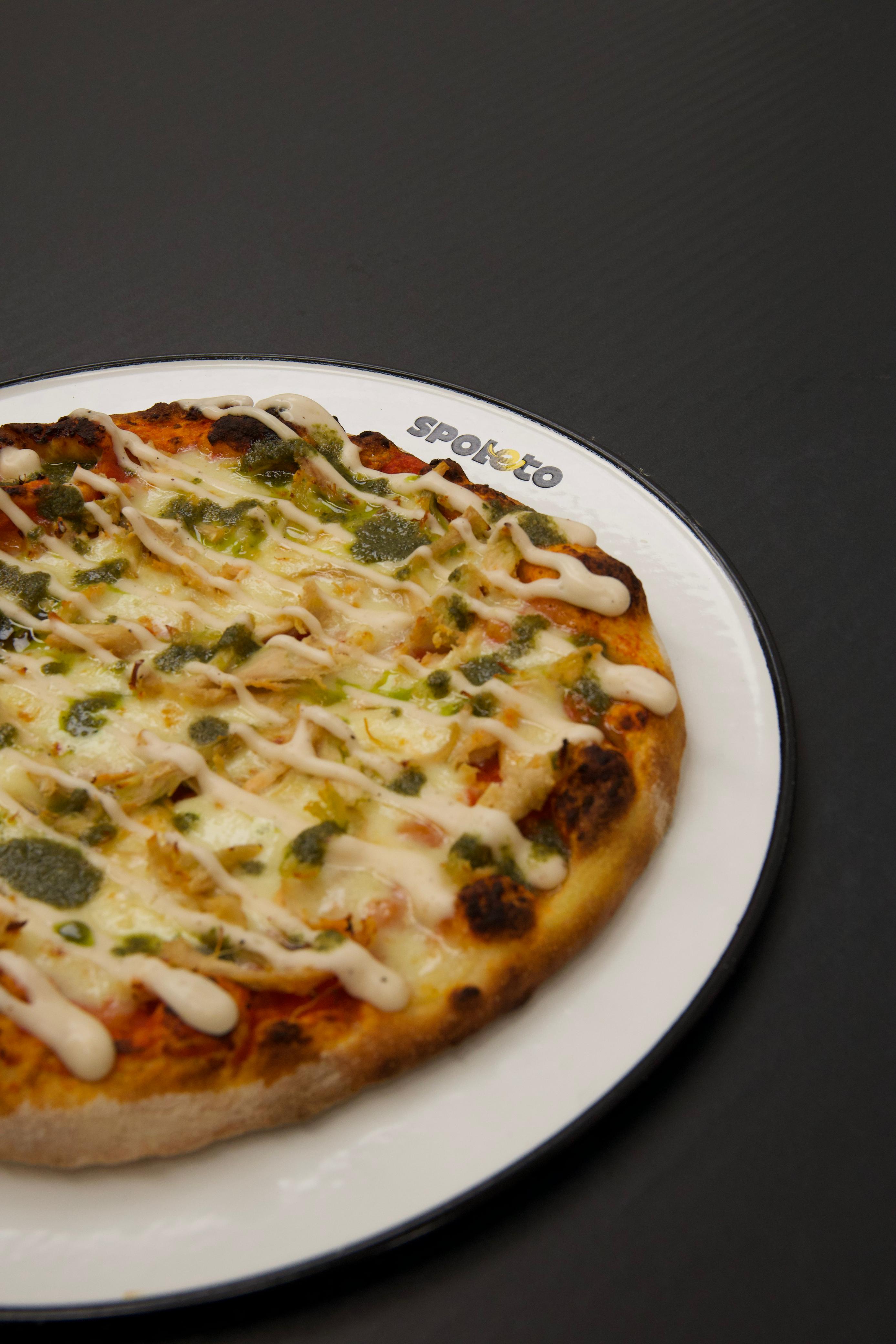 Pizza 4 porciones con base artesanal, salsa pomodoro, pollo a la plancha, chapiñones frescos, toque de alioli y pesto, con queso mozzarella gratinado