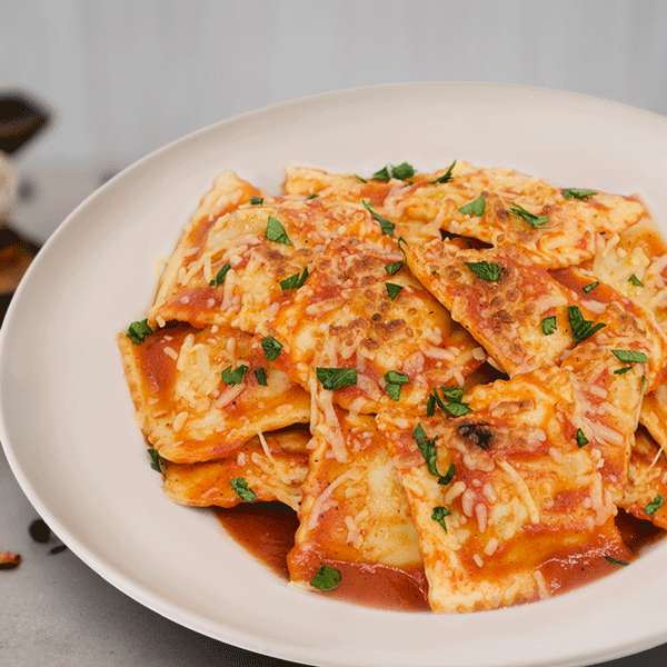 Raviolis gigantes rellenos de queso ricota y espinaca acompañados de salsa pomodoro queso mozarela y parmesano gratinado.