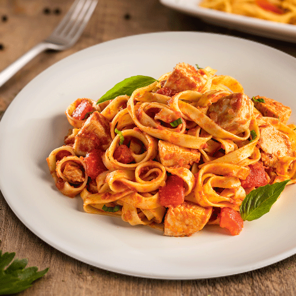 Fetuccini salteado acompañado en salsa rustica, trozos de pollo y queso parmesano