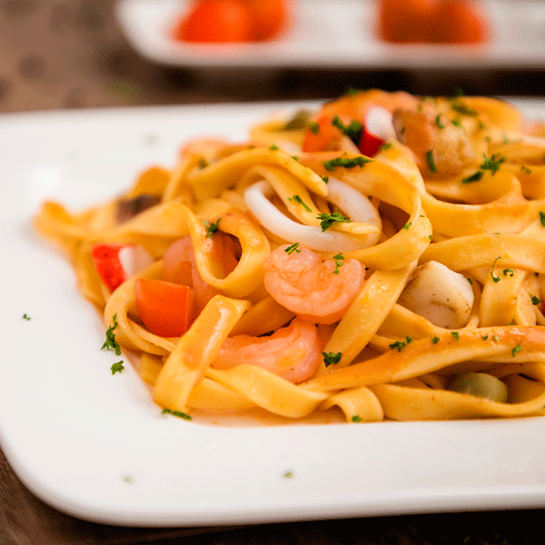 Fetuccini salteado acompañado en salsa Marinera, Frutos del mar y queso parmesano