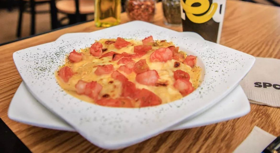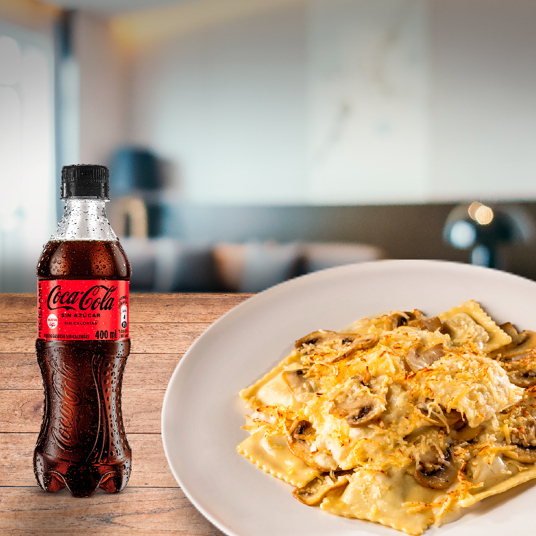 Ravioli gratinado relleno de camarón bañado en salsa napolitana con queso y mas camarones, acompaña con una Coca-cola.