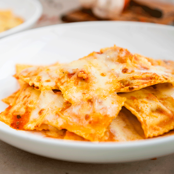 Raviolis gigantes con corazón de carne, salsa pomodoro, queso mozarela y parmesano gratinado.