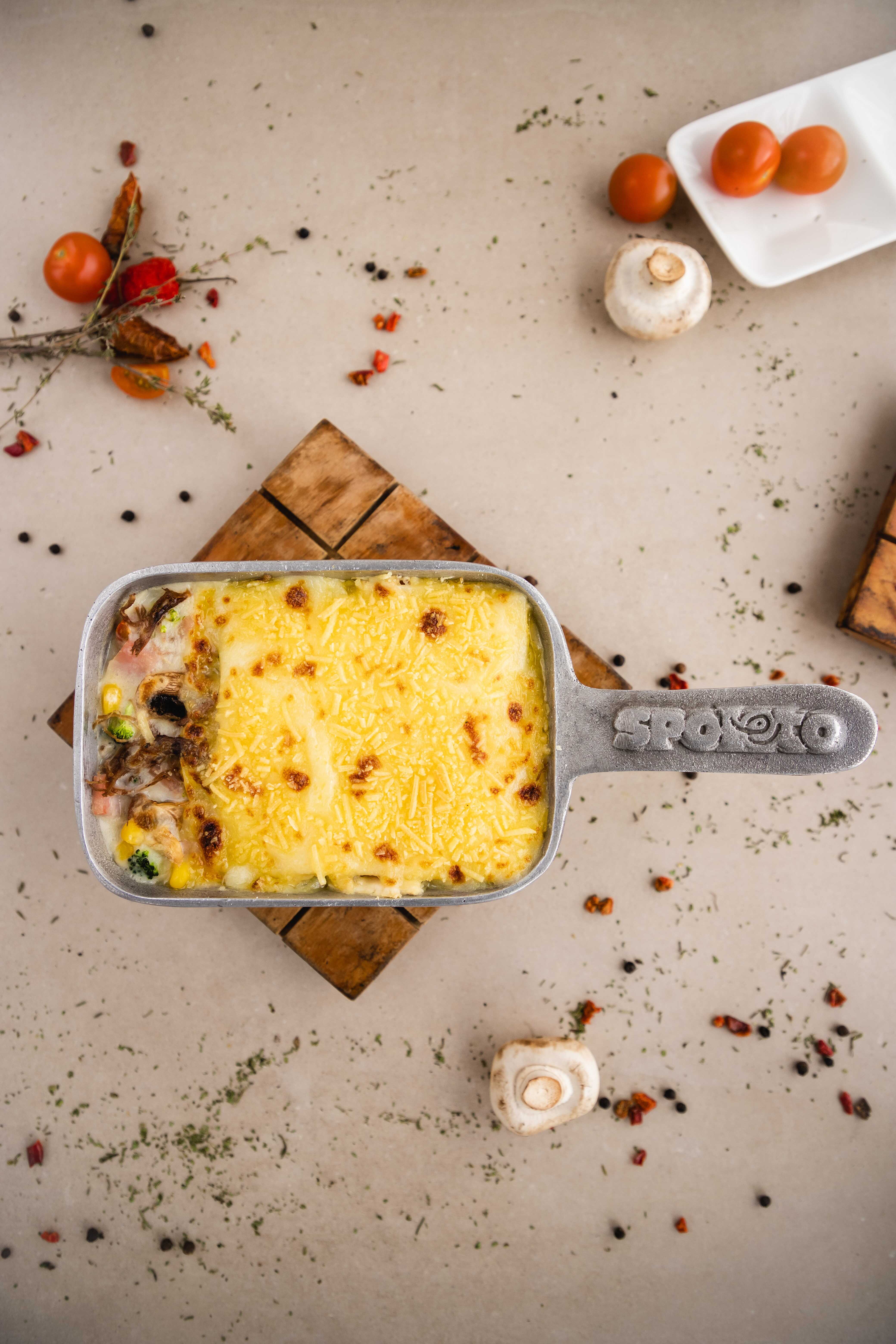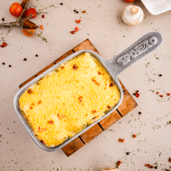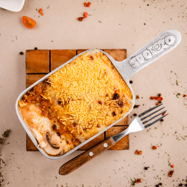 Una exquisita combinación de salsa bolognesa, salsa de champiñones, queso mozzarella, trozos de pollo y queso parmesano gratinado.