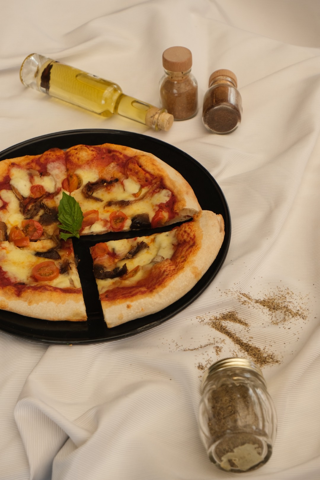 Pizza 4 porciones con base artesanal, salsa pomodoro, mix de orellanas salteadas, tomates cherry y queso mozarella gratinado