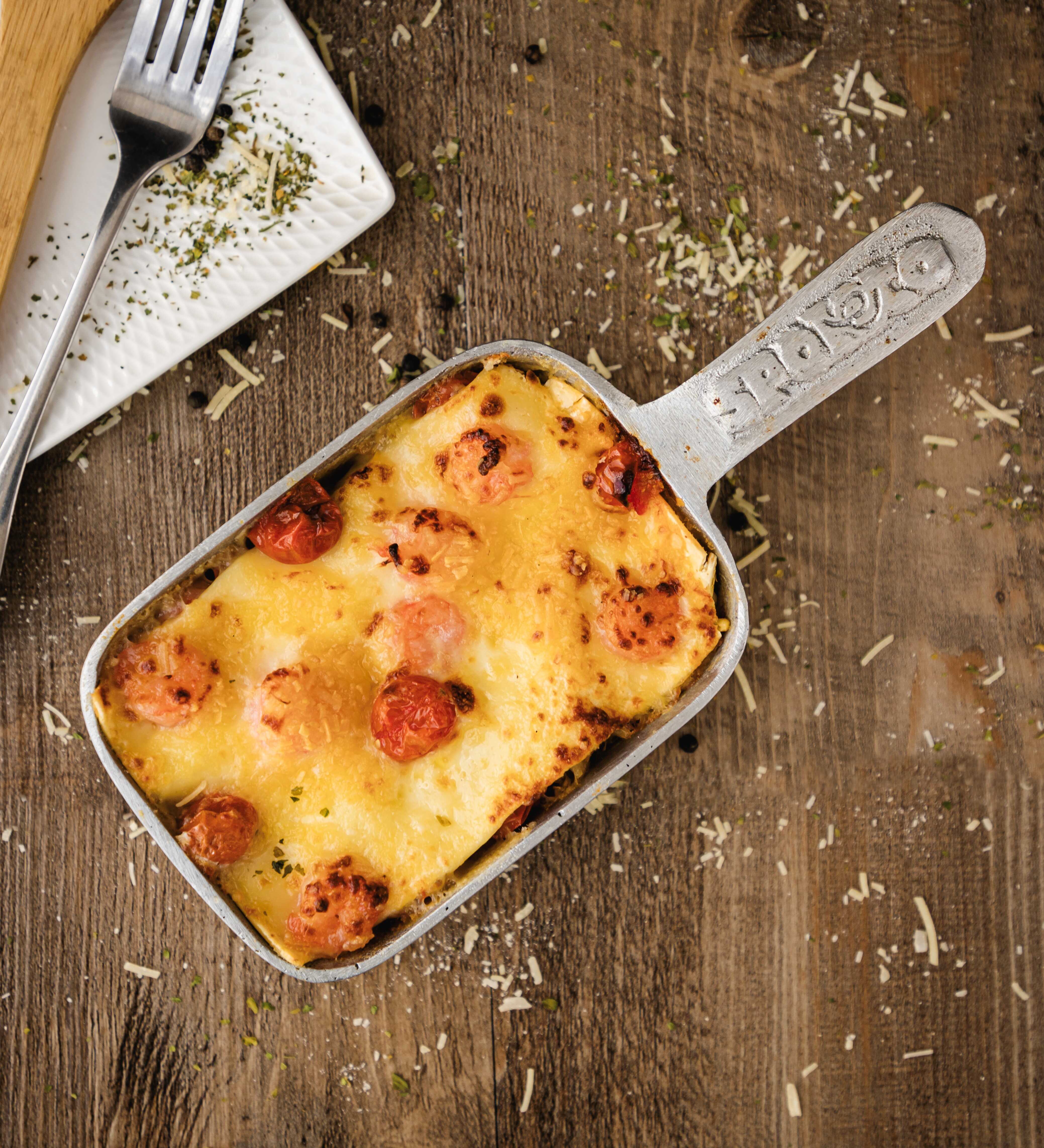 Nuestra receta artesanal de salsa boloñesa acompañada de queso mozarela y parmesano gratinado.