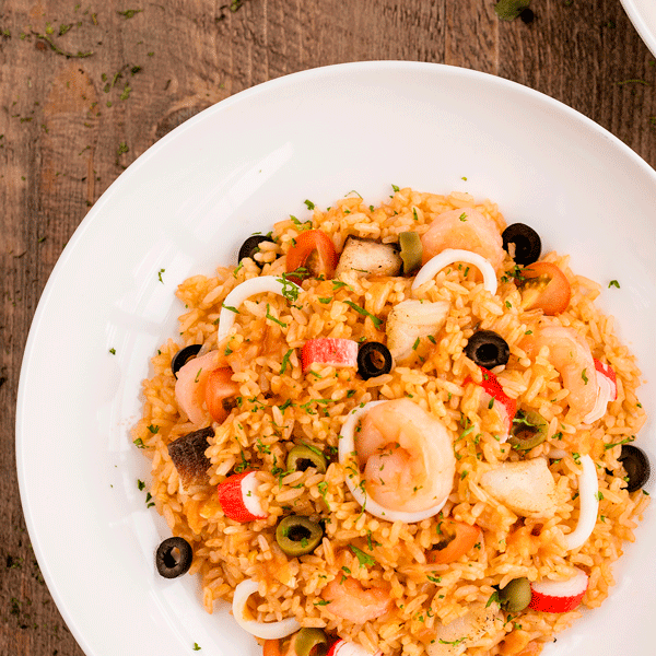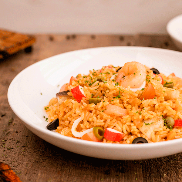 Frutos del mar en salsa marinera con arroz