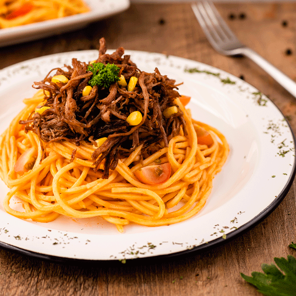 Spaghetti salteado en salsa napolitana acompañados de maíz, tomate cherry y carne desmechada incluye queso parmesano