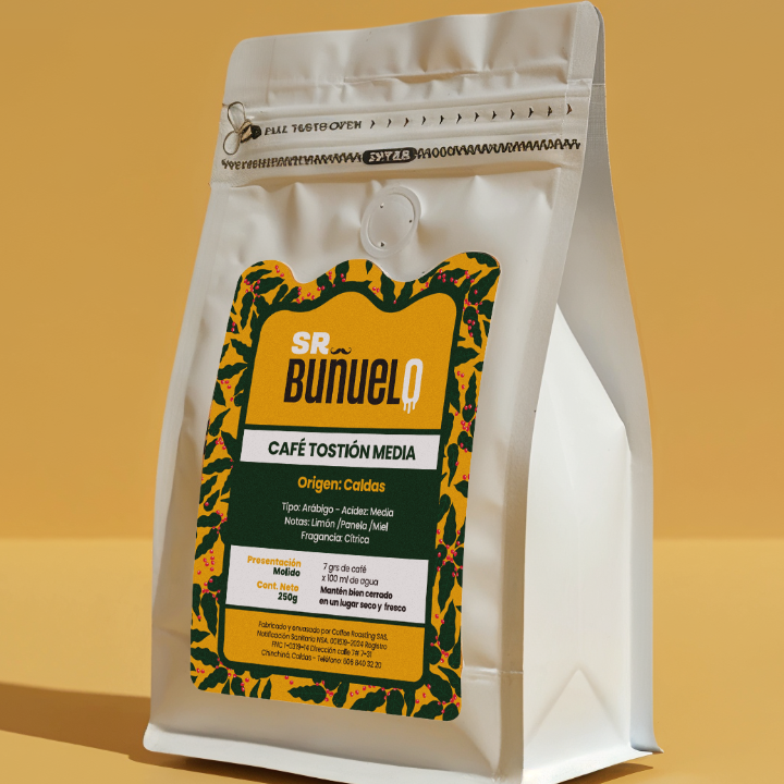 Café de origen caldense de tostión media. Tipo arábigo, acidez media con notas de limón, panela y miel. Fragancia cítrica.