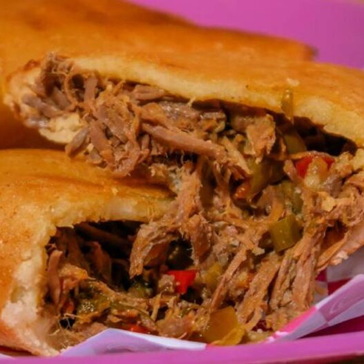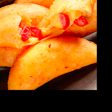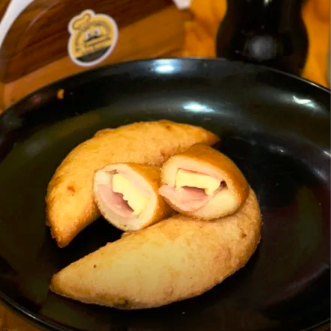 Empanada de harina de maíz, rellena con salchicha y queso.
